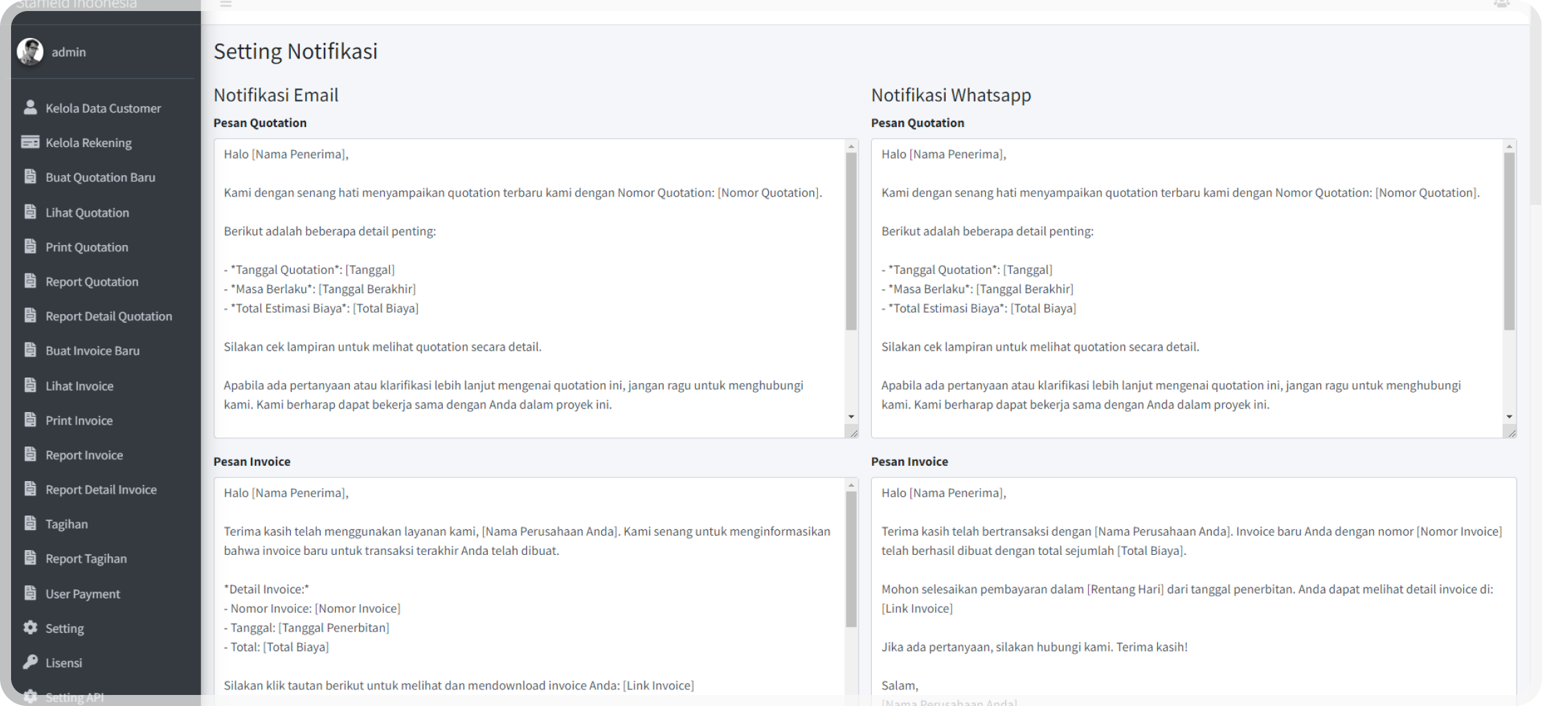 pengaturan notifikasi di halaman website kami, Anda dapat dengan mudah mengonfigurasi notifikasi untuk pengguna melalui email dan WhatsApp