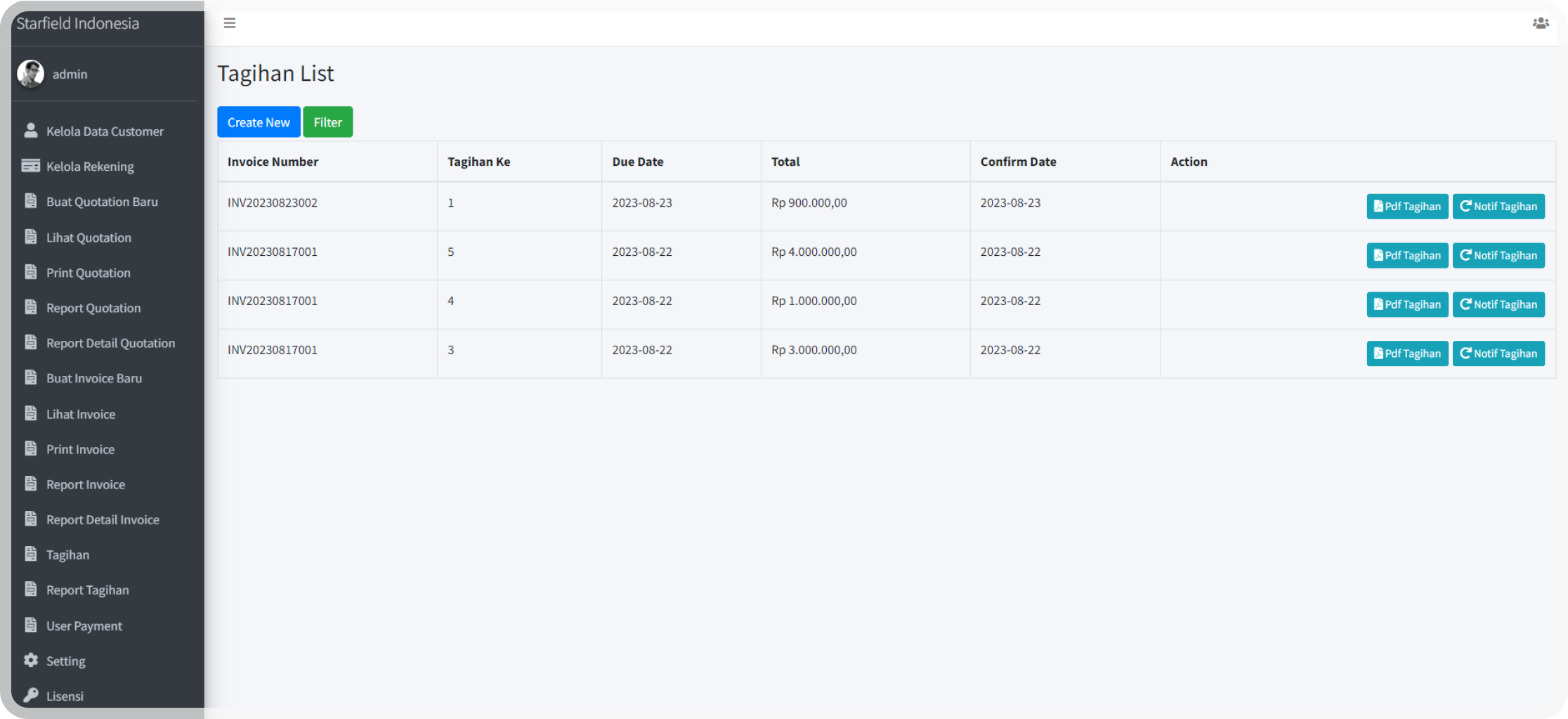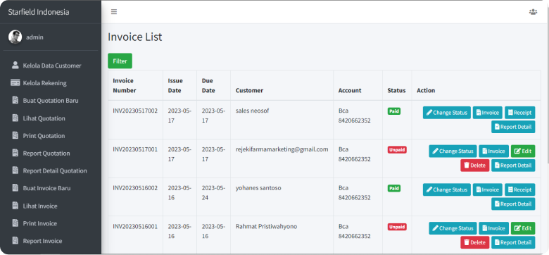Daftar invoice yang pernah Anda buat lengkap dengan status invoicenya