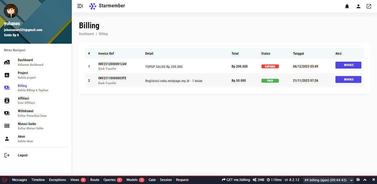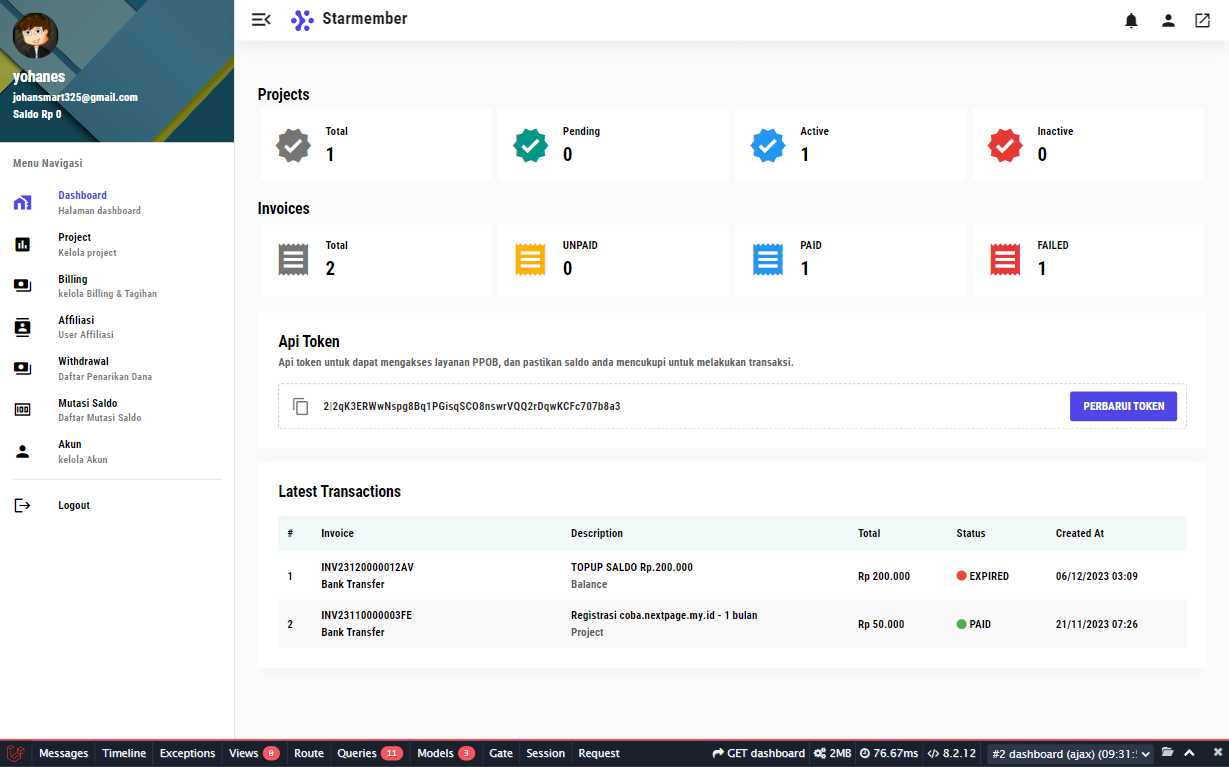 Dalam Dashboard Billing, Anda dapat membuat proyek, mengelola afiliasi, dan melihat ringkasan pesanan.