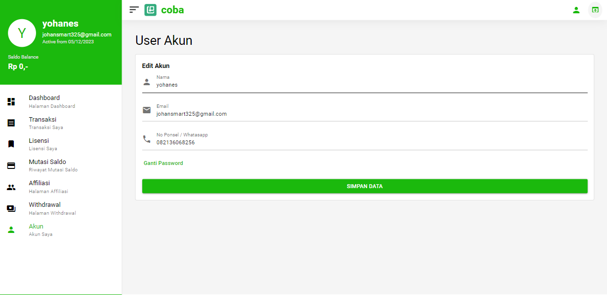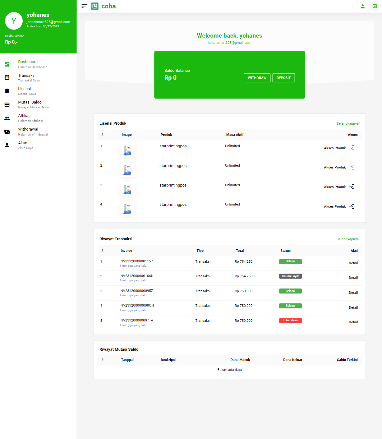 Akses ke halaman utama yang memberikan ringkasan informasi penting terkait akses product, Riwayat Transaksi & Riwayat Mutasi Saldo.