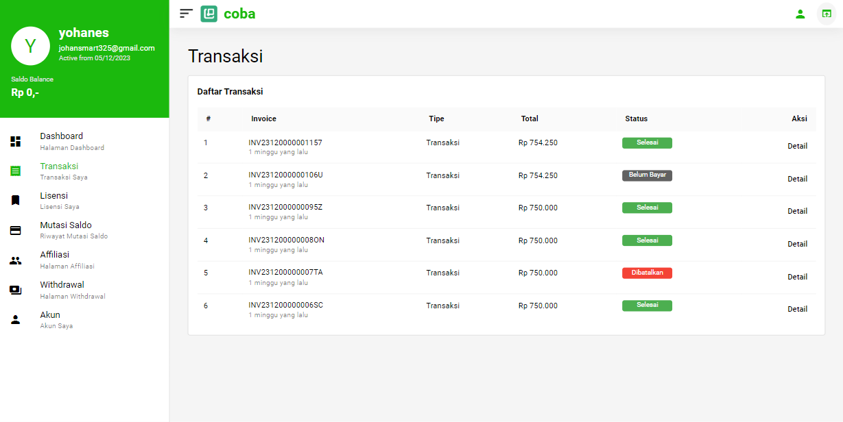 Bagian yang menyajikan riwayat transaksi yang dilakukan oleh pengguna, termasuk pembelian.