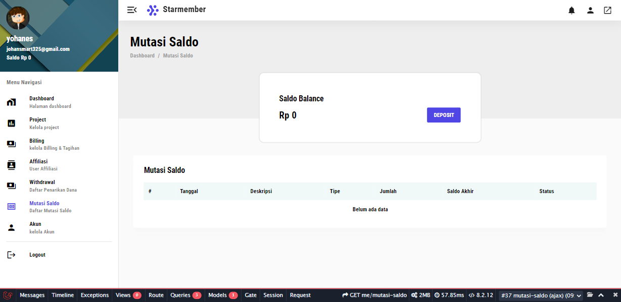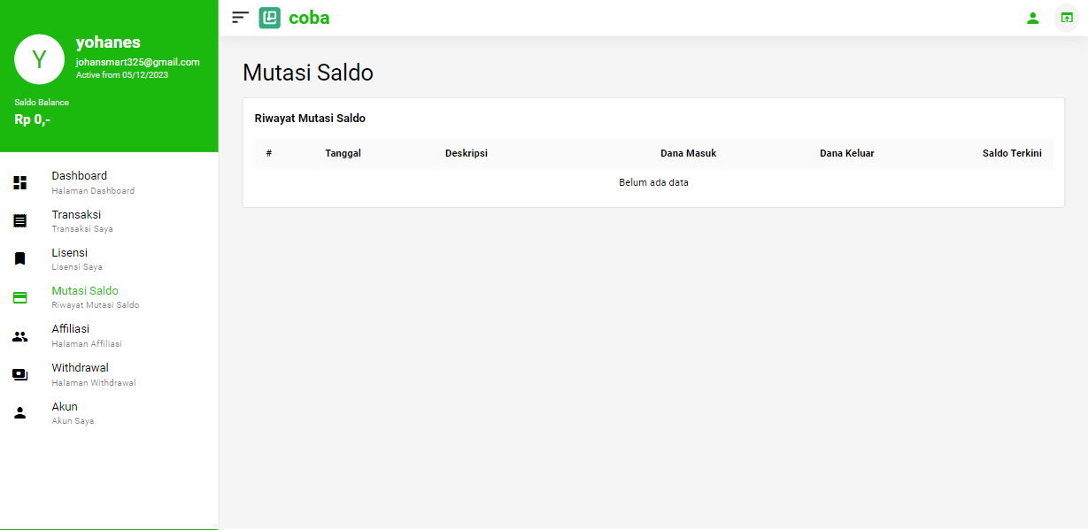 Bagian yang memperlihatkan riwayat perubahan saldo atau dana dalam akun pengguna. Ini mencakup detail transaksi, penambahan, atau pengurangan saldo.