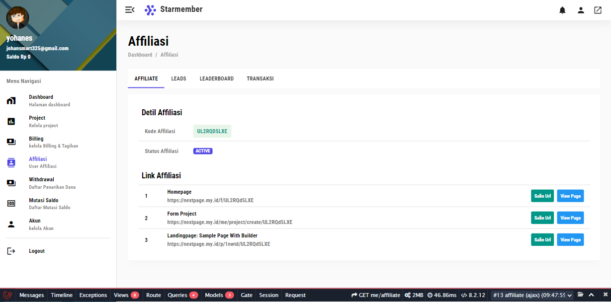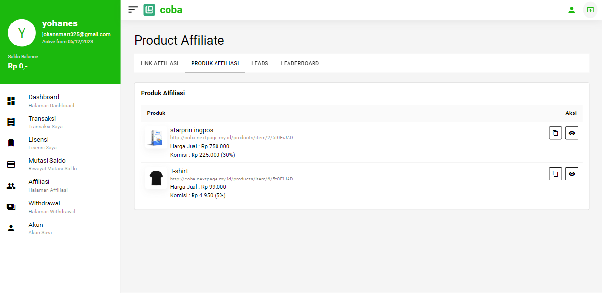 Akses ke halaman yang terkait dengan program afiliasi yang mungkin diikuti oleh pengguna, termasuk informasi Produk Affiliasi, Lead dan Leaderboard.