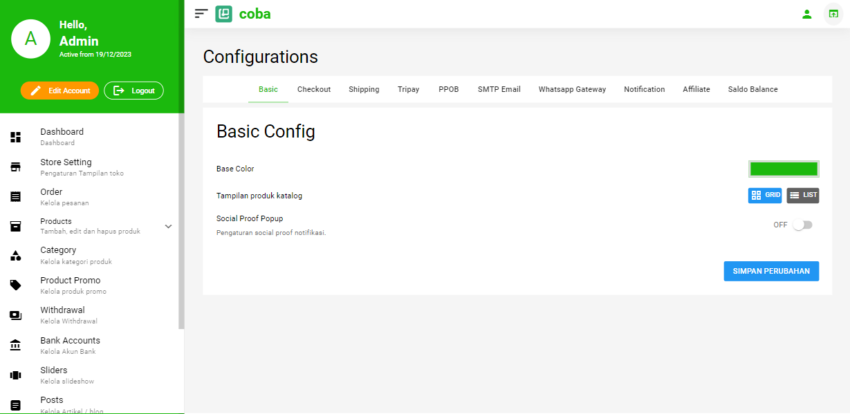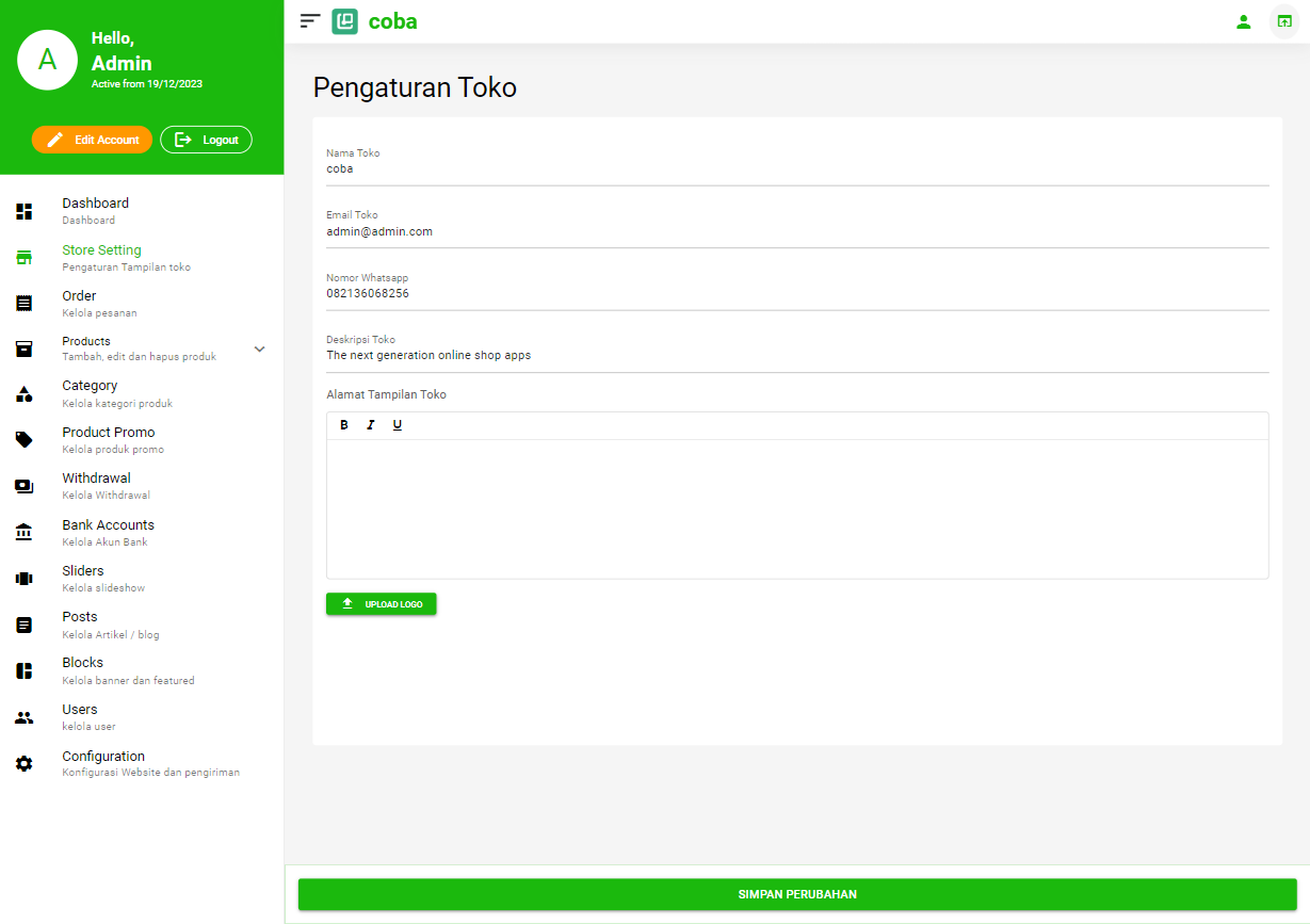 Fitur yang memungkinkan pengaturan terhadap Nama toko, Email toko, No Whatsapp, Deskripsi toko, dan Alamat tampilan toko.