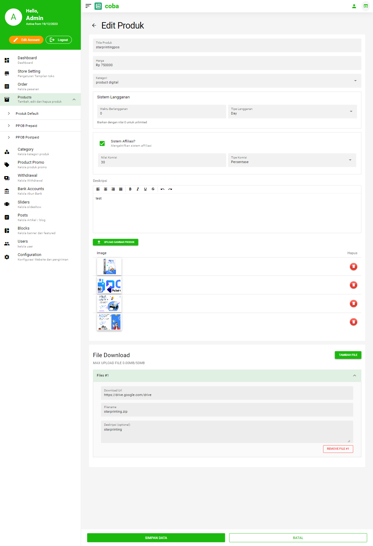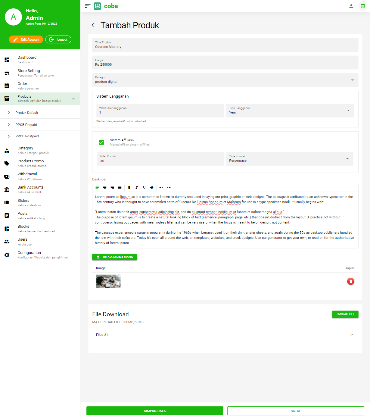Fitur untuk menawarkan produk dalam bentuk digital yang dapat diunduh oleh pelanggan setelah pembelian, seperti e-book, musik, atau file digital lainnya.