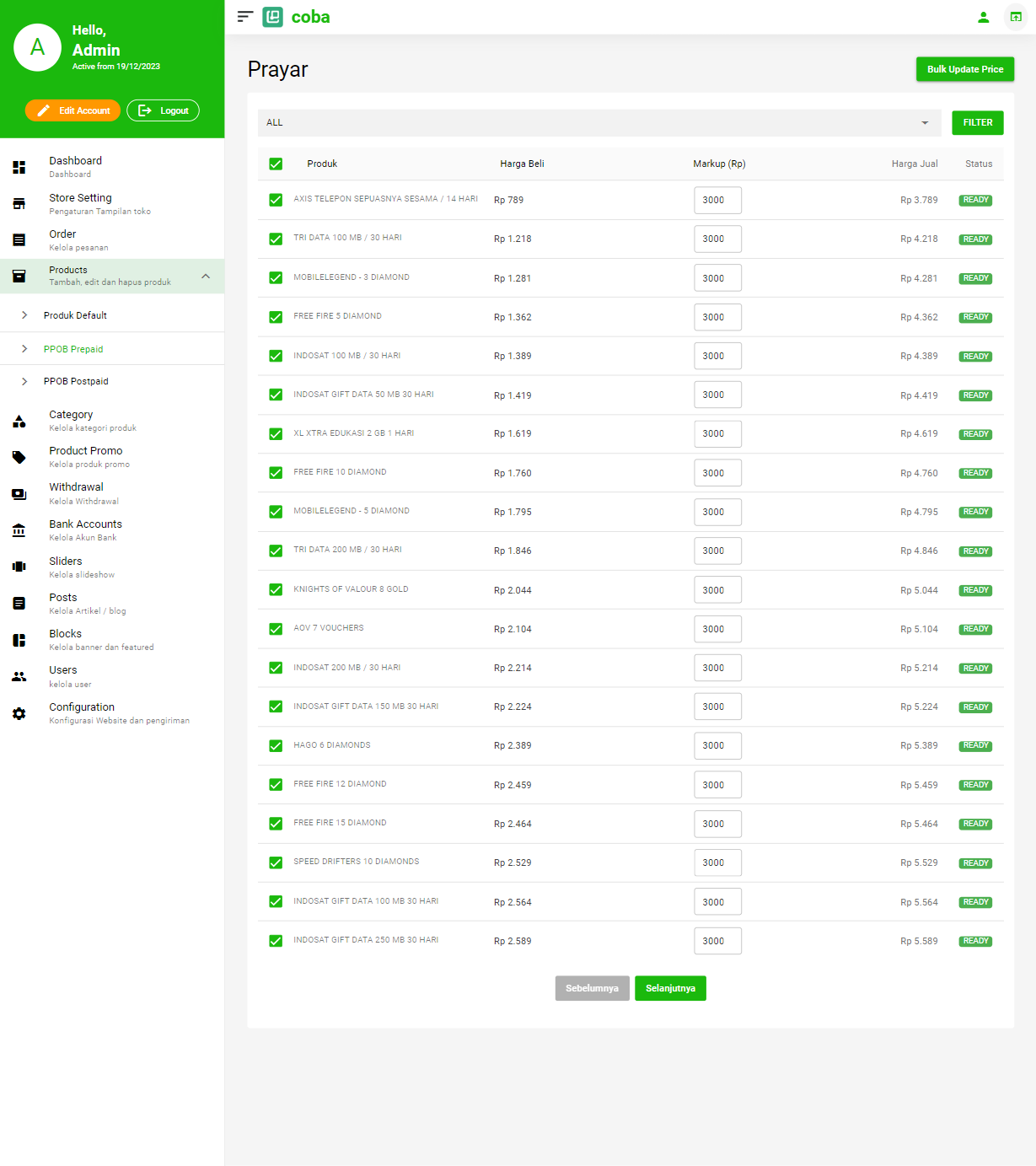 Produk-produk yang terkait dengan layanan pembayaran prabayar, seperti top-up pulsa, token listrik, atau pembayaran prabayar lainnya.