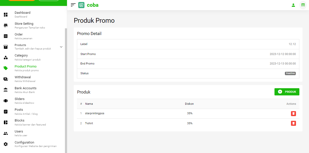 Bagian untuk mengelola promosi produk, termasuk diskon atau penawaran khusus.