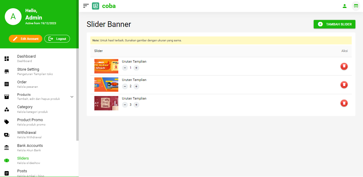 Pengaturan slideshow atau gambar utama yang ditampilkan pada halaman depan toko online.