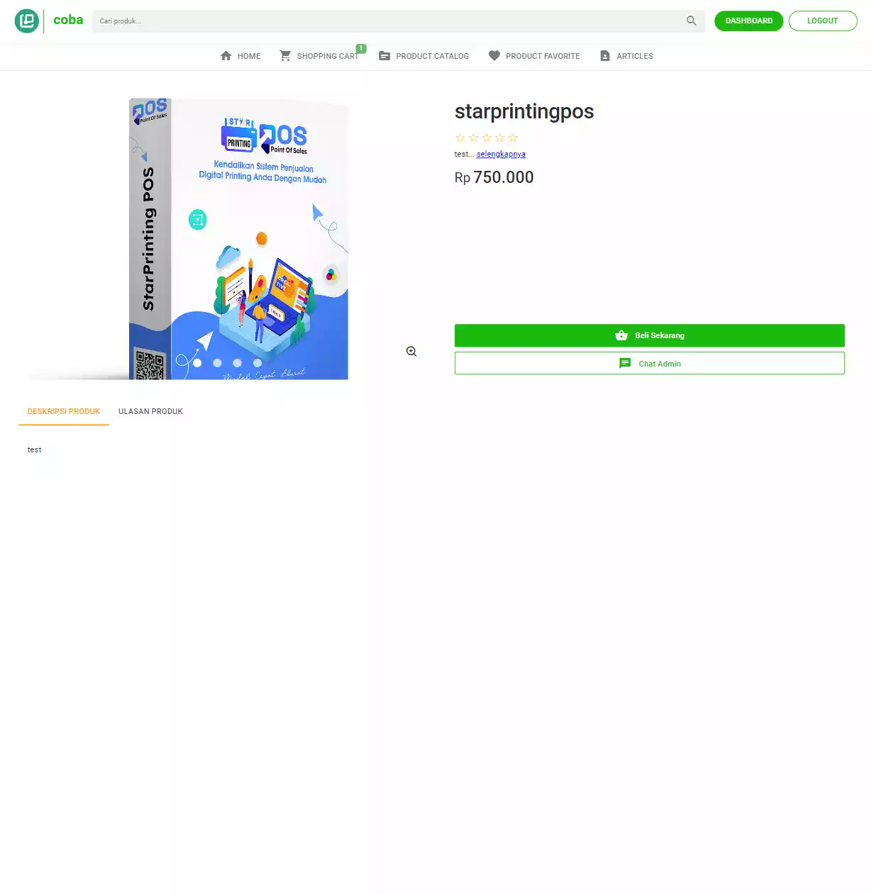 Halaman detail yang menampilkan informasi lengkap tentang satu produk. Di sini pengunjung dapat melihat deskripsi, gambar, harga, dan opsi pembelian.