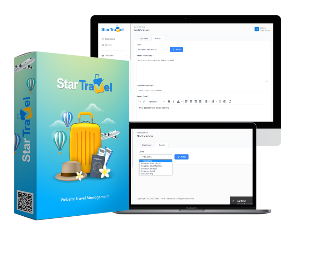 Startravel menyediakan Menu Pesan Notifikasi. Anda bisa mengirimkan pesan ke customer untuk menawarkan produk baru atau menawarkan promo melalui WhatsApp dan Email