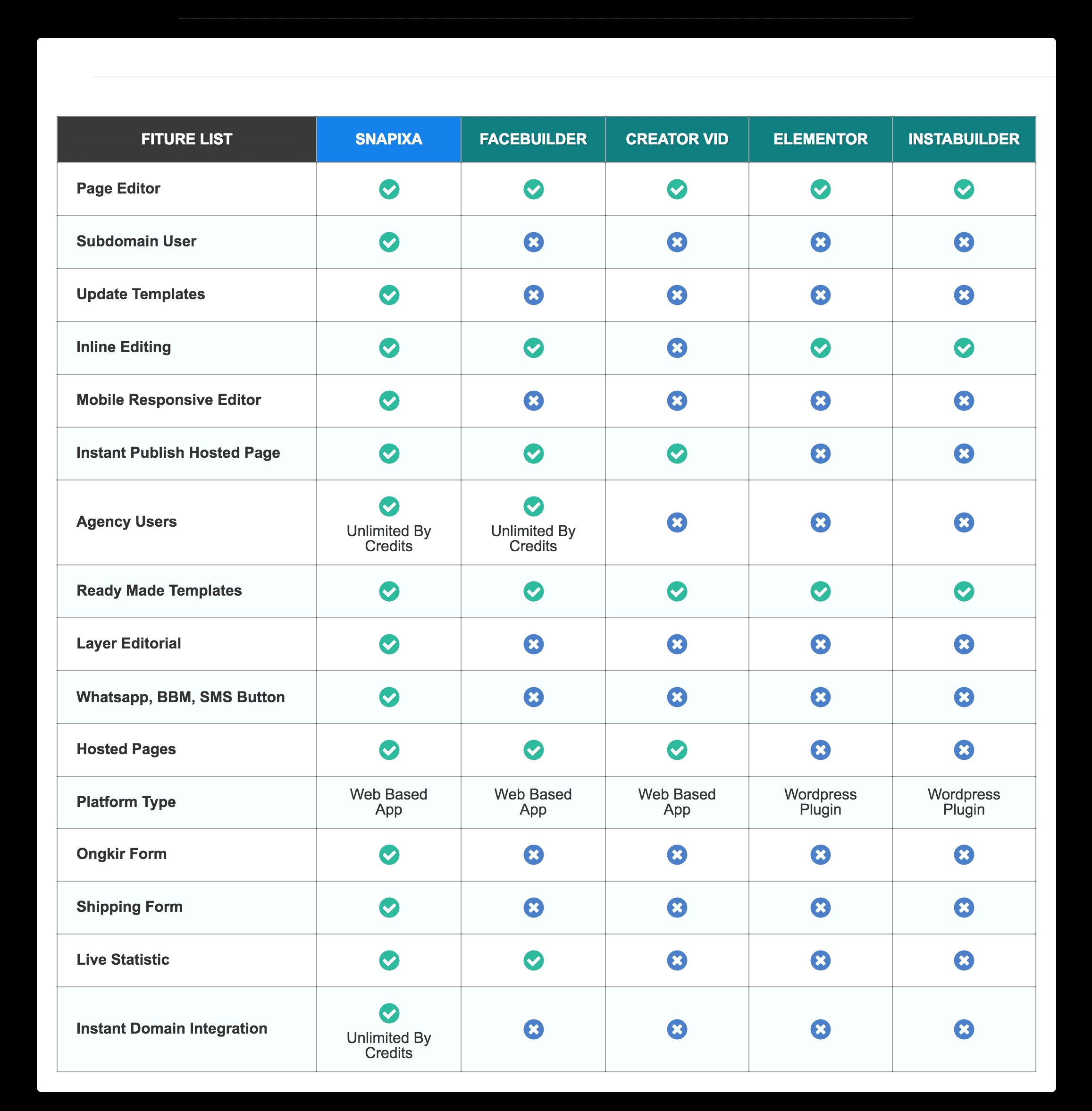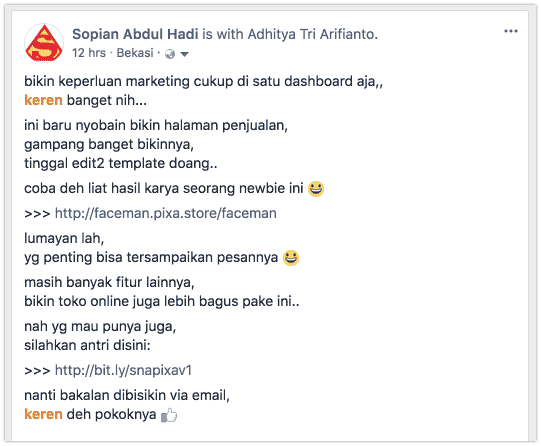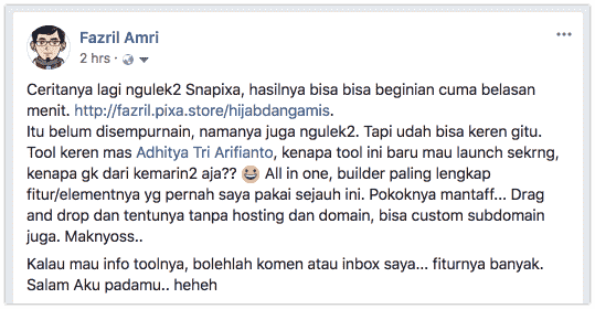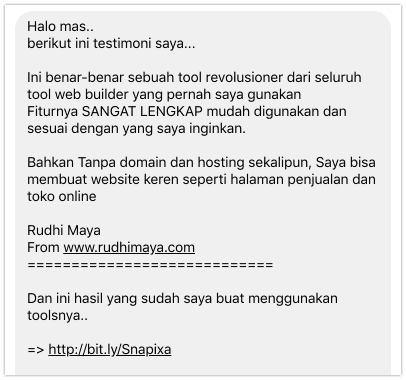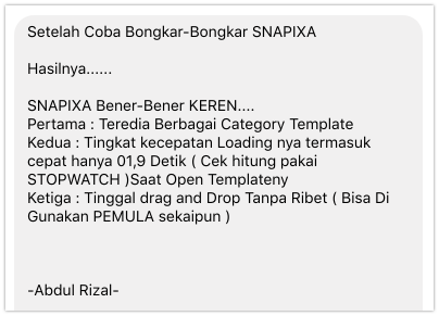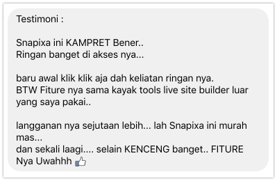“snapixa keren banget ! belum pernah saya temuin tools all in one marketing seperti snapixa, tools web based tidak perlu sewa hosting dan domain. tinggal login terus anda bisa dengan mudah membuat website company profile , toko online, lading page , sales page, form konfirmasi, dll dengan sangat mudah tinggal klik . saya sangat merekomendasikan tools ini bagi anda yang sedang membangun bisnis online bahkan sangat cocok bagi anda yang sudah terjun di bisnis online, solusi hemat tools marketing anda.”