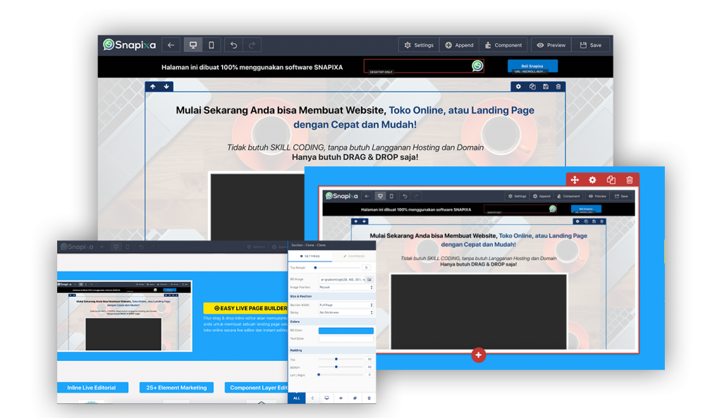 Tanpa perlu keahlian apapun, anda sudah membuat sebuah website atau halaman penjualan yang mudah dengan inline editor drag & drop dari snapixa ini. Inlined editor sendiri adalah sebuah cara editing halaman tanpa keahlian coding, HTML!